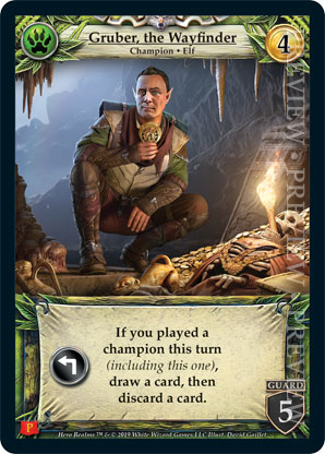 | Journeys Kickstarter Promo Pack | 1 | Gruber, the Wayfinder | {Expend}: If you played a champion this turn (including this one), draw a card, then discard a card. | Champion ◆ Elf | Wild | 4 | 5 Guard | Market Deck | David Gaillet | |||