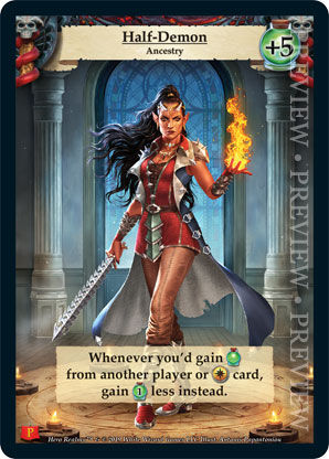 | Journeys Kickstarter Promo Pack | 1 | Half-Demon | Whenever you'd gain {Health} from another player or {Imperial} card, gain {1 health} less instead. | Ancestry | Health +5 | Avatar | Antonis Papantoniou | |||||