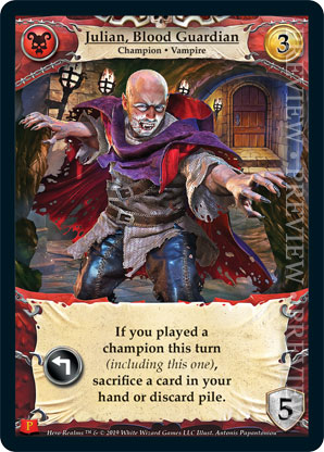 | Journeys Kickstarter Promo Pack | 1 | Julian, Blood Guardian | {Expend}: If you played a champion this turn (including this one), sacrifice a card in your hand or discard pile. | Champion ◆ Vampire | Necros | 3 | 5 | Market Deck | Antonis Papantoniou | |||