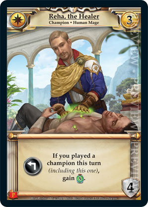| Journeys Kickstarter Promo Pack | 1 | Reha, the Healer | {Expend}: If you played a champion this turn (including this one), gain {5 health}. | Champion ◆ Human Mage | Imperial | 3 | 4 | Market Deck | Siregar | |||
