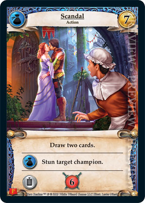 | Journeys Kickstarter Promo Pack | 1 | Scandal | Draw two cards. {Guild Ally}: Stun target champion. {Sacrifice}: {Gain 6 combat} | Action | Guild | 7 | Market Deck | Lester Niesta | ||||