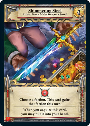 | Journeys Kickstarter Promo Pack | 1 | Shimmering Steel | {Gain 4 combat} Choose a faction. This card gains that faction this turn. When you acquire this card, you may put it into your hand. | Artifact Item ◆ Melee Weapon ◆ Sword | 4 | Artifact Deck | Kingsley Calungeagin | |||||
