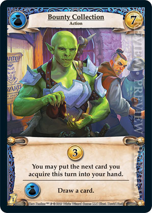 | Journeys: Travelers | 1 | Bounty Collection | {Gain 3 gold} You may put the next card you acquire this turn into your hand. {Guild Ally}: Draw a card. | Action | Guild | 7 | Market Deck | David Nash | ||||