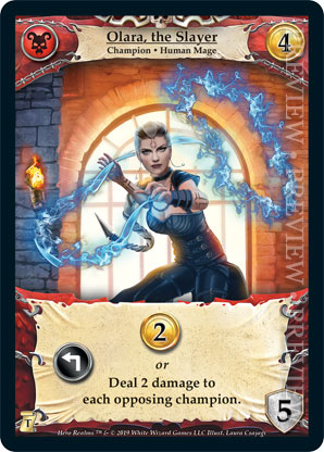 | Journeys: Travelers | 1 | Olara, the Slayer | {Expend}: {Gain 2 gold} Deal 2 damage to each opposing champion. | Champion ◆ Human Mage | Necros | 4 | 5 | Market Deck | Laura Csajagi | |||